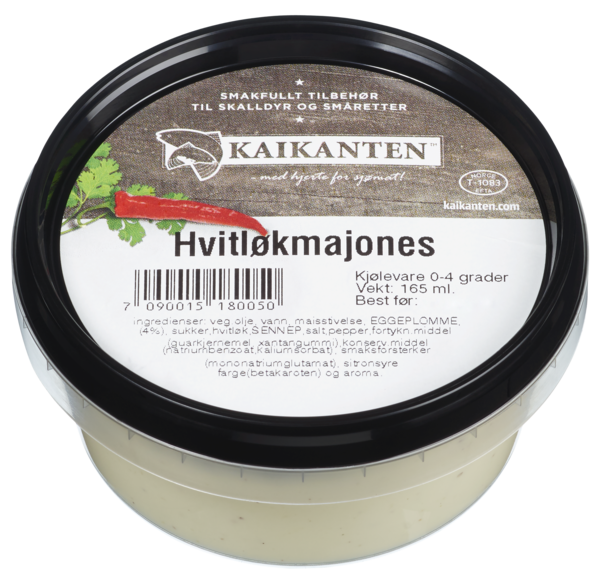 Hvitløksmajones som passer til skalldyr, pizza og tapas.