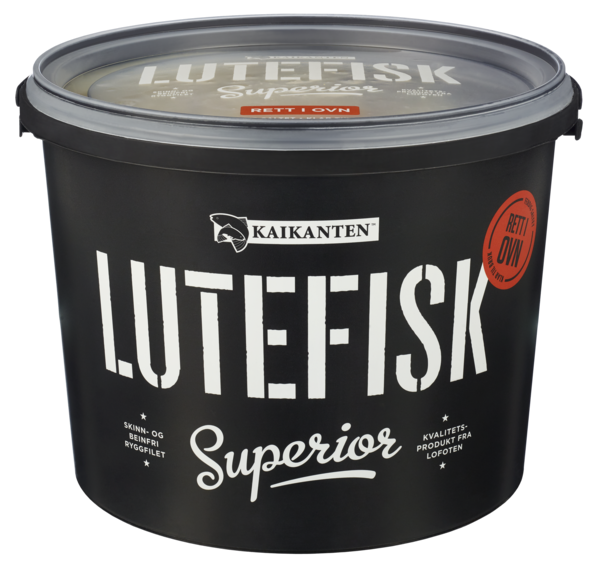 Lutefisk 2.5kg i saltlake er lutefisk laget på klippfisk. Fisken er klar til å trekkes i usaltet vann. Den bakes i ovn eller varmebehandles i kombidamper.